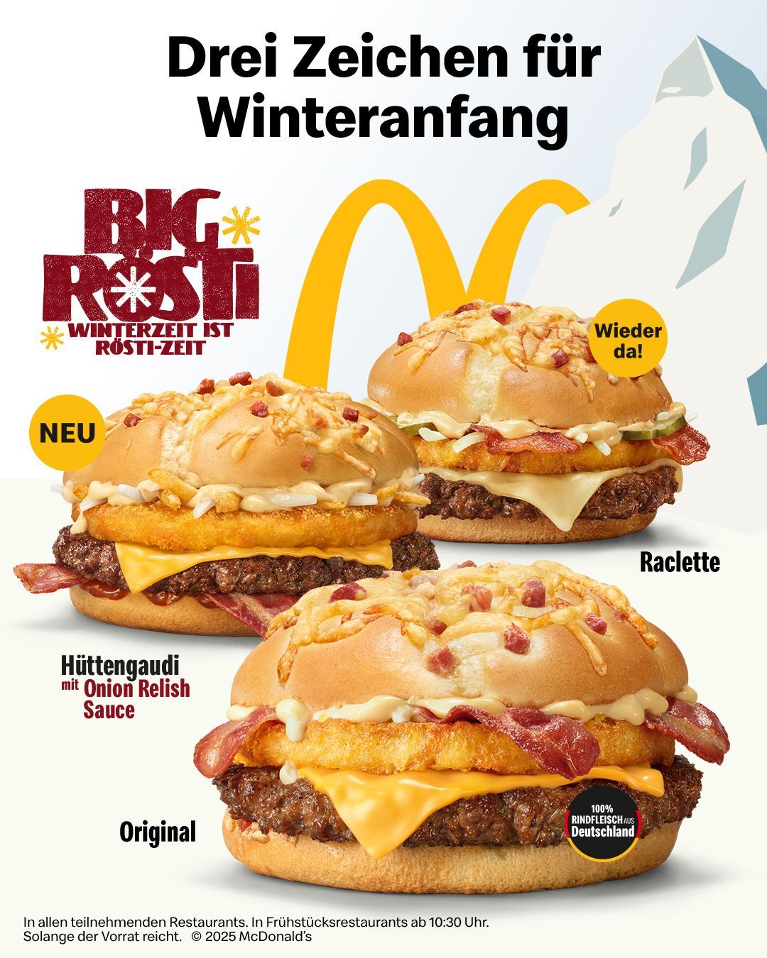 1. Big Rööööstiii ist zurüüüück. 2. Nicht alleine, sondern mit unserem neuen Big Rösti Hüttengaudi. 3. Und bis zum 03.12.: der Big Rösti Raclette. Winterzeit ist Röstizeit! #ichliebees #winterzeitiströstizeit In teilnehmenden Restaurants. In Frühstücksrestaurants ab 10:30 Uhr. Nur solange der Vorrat reicht. © 2025 McDonald‘s